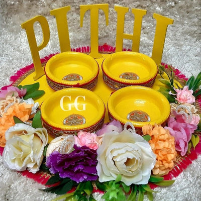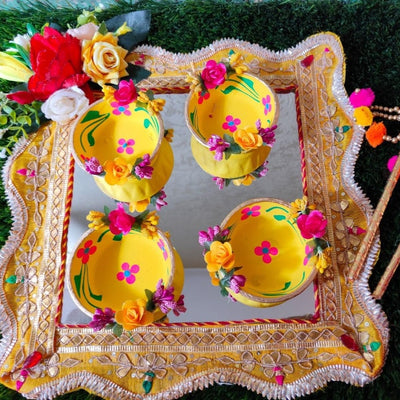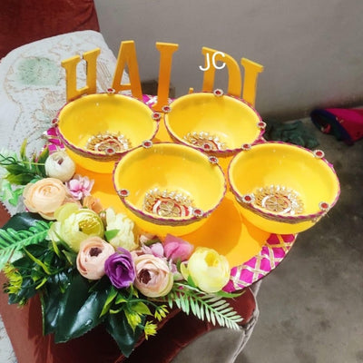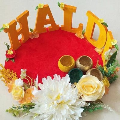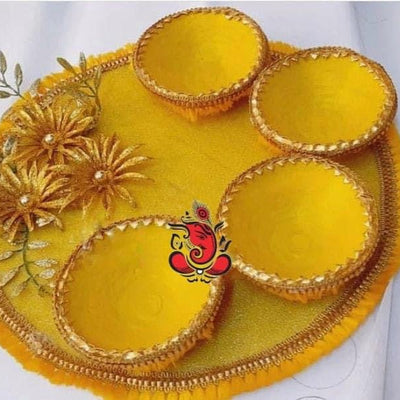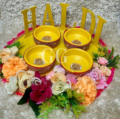 -Haldi platters are decorative trays used in the Haldi ceremony, a pre-wedding ritual in Indian cultures -During the ceremony, a paste of turmeric, sandalwood, and rosewater is applied to the bride and groom for glowing skin and good fortune. -The platter typically holds small bowls containing the haldi paste, along with other auspicious items like flowers, sweets, and lamps -Haldi platters are not only functional but also serve as a beautiful centerpiece for the ceremony, symbolizing the blessings and joy of the occasion