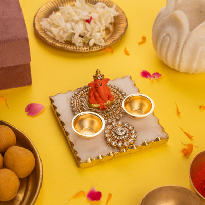 -The Laxmi Charan design symbolizes the arrival of Goddess Laxmi, the deity of wealth, prosperity, and good fortune, during Diwali. It's a beautiful and auspicious tradition to welcome her blessings into your home. -This beautiful piece on marble platter with symbols and Swastika is a perfect blend of art -Platter size 4 inches -Below base 6 inches -Charan approx 3.5 inches gold plating